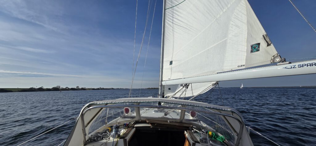 Een mooi tochtje, waarbij we in vier en een half uur zo’n 22 mijl hebben gezeild. Jacques liet duidelijk merken dat hij de maximale snelheid uit de boot wilde halen, en we hebben de overstagmanoeuvre verder geoptimaliseerd. De spinnakerboom-gebruiken bij het vlinderen bewaren we voor de volgende trip.