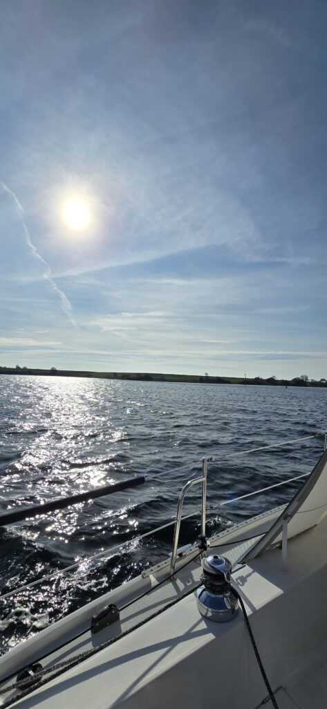 De dag begon grijs, maar al snel na het uitvaren brak de zon door. Leuk om vanuit deze hoek van de Grevelingen te starten – het rondje andersom. De wind was ZZO en liep tot ongeveer 18 knopen. Mooie omstandigheden voor een klein rondje onder langs de Hompelvoet en om Archipel heen. Een kort kruisrak naar de Zuidkant van de Grevelingen, waar we de Stampersplaat en Dwars-in-de-Weg met de klok mee hebben gerond.