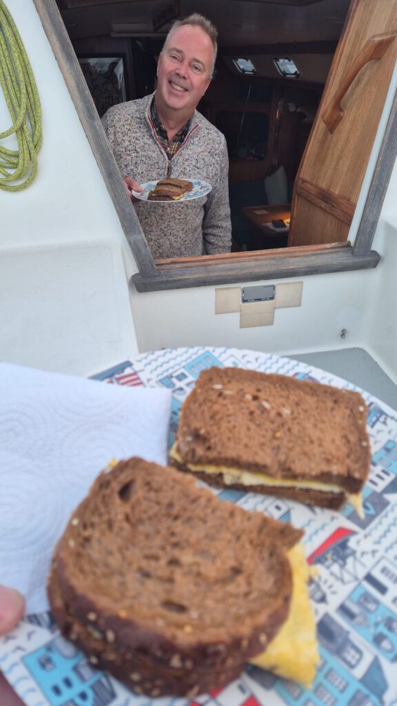 Na een nacht met 35 knopen wind ontvingen we Angèle en Jacques voor een dagje zeilen op de Grevelingen. Beiden hebben zeilervaring en dat was vanwege de omstandigheden meer dan welkom. Nadat we tijdens de koffies de eerste regenbui met veel wind aan ons voorbij hebben laten waaien, was het tijd om de landvasten los te gooien.