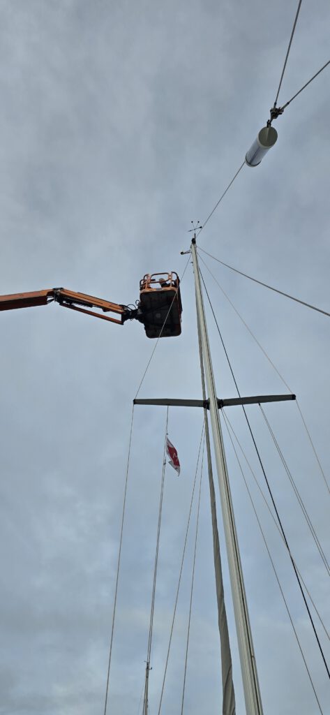 Met een lange ver-rijker heeft Marco zich bovenin naast de mast gepositioneerd en de topbedekking van de mast losgemaakt. Daar bleek inderdaad het blokje van de genuaval overleden te zijn. Voor de zekerheid is ook het blokje aan SB van de reserveval vervangen en is het spi-pennetje een slag groter uitgevoerd.