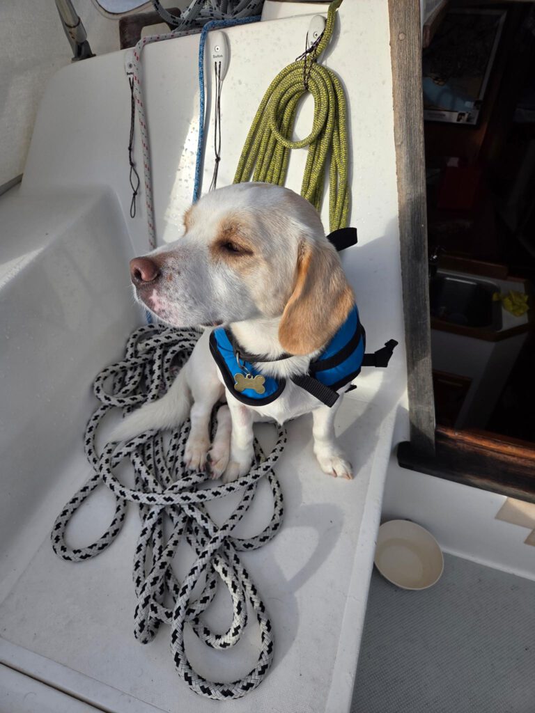 Al enige tijd lukte het niet om de genuaval door te zetten en bleef onderin een stukje zeil over dat eigenlijk tien centimeter hoger wilde zitten. Frank was al een keer de mast in getakeld en de conclusie was dat waarschijnlijk het blok – de roller – bovenin de mast vast zat of dat de val er op de een of andere manier langs was getrokken.
