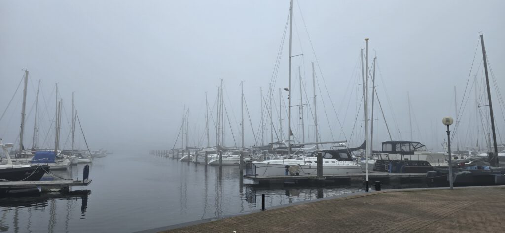 Rond negen uur arriveerden Jan-Willem en Etienne op tijd voor de koffie en voor het palaver – na een mistige autotocht. Annemiek en David waren reeds aan boord. De mist bleek hardnekkig en tijdens het palaver werd besloten om de start met tenminste een uur uit te stellen.
