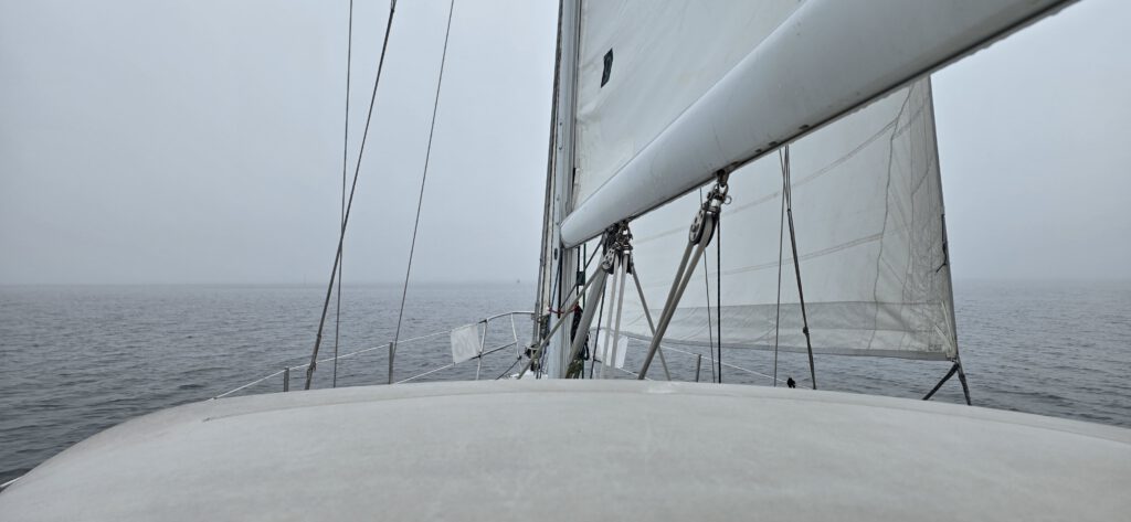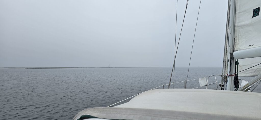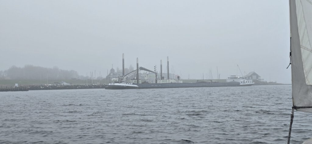 Wat doe je dan? De meeste bemanningen keerden huiswaarts, maar wij wilden toch wel even proberen om “op de tast” te varen. De wind bleek wispelturig en de mist hardnekkig. Maar als de motor dan uitgaat en de boot door het water glijd dan ben je blij dat je toch even een momentje hebt gepakt.